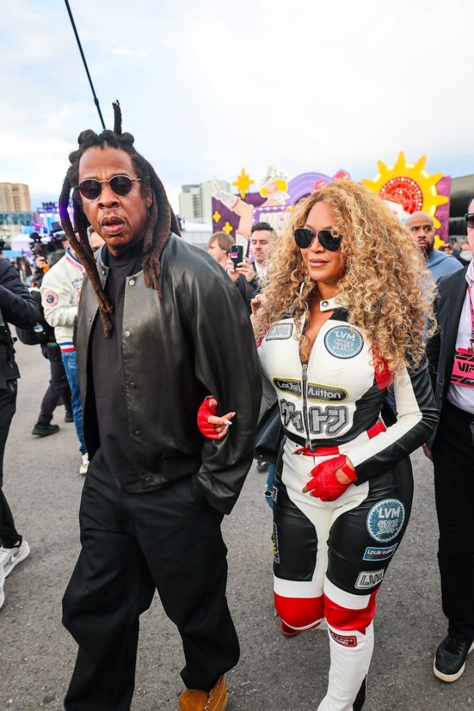 Jay-Z kept things grounded in all-black with Timberland boots, the visual equivalent of standing back and letting your partner take the spotlight she naturally commands.