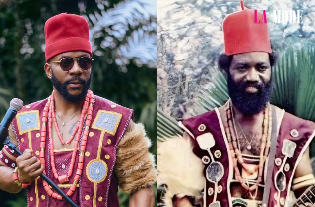Big Brother Naija host Ebuka Obi-Uchendu channels highlife legend Oliver De Coque in a regal burgundy ensemble rich with cultural flair and contemporary edge.