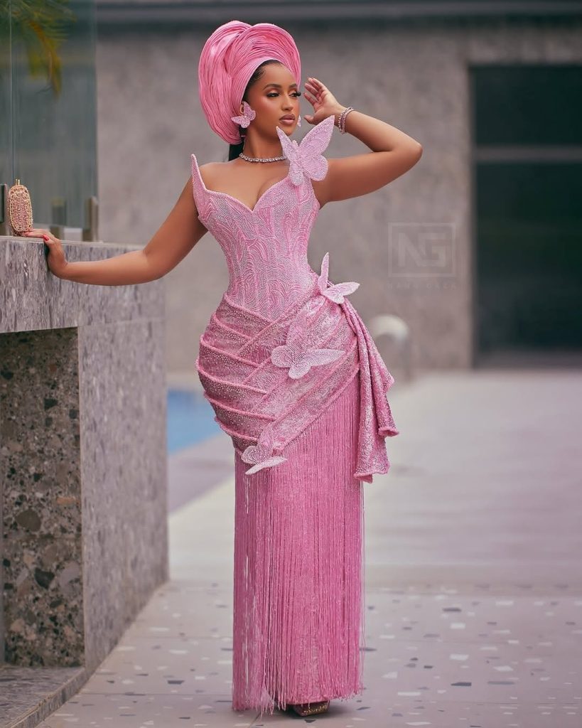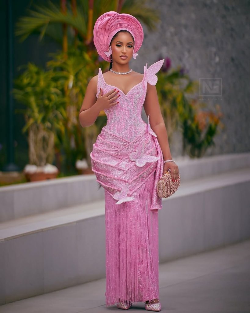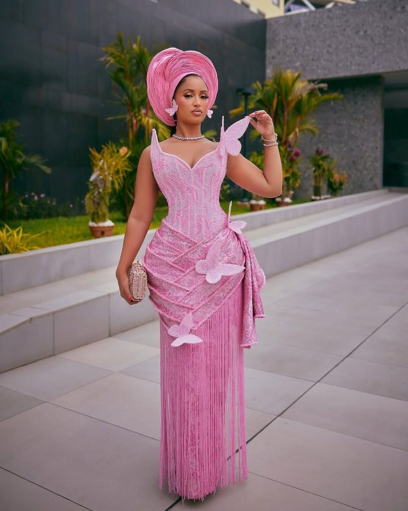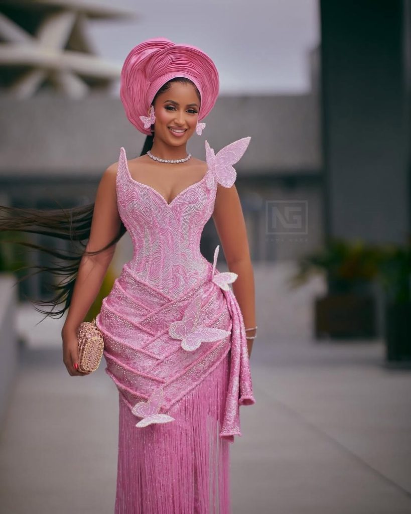 And then there’s the gele. Voluminous, dramatic, and dipped in the same hot pink hue as the gown—it completes the look like a crown does a queen. Butterfly earrings and a bejeweled clutch bring the whole thing home. You’re not just showing up in this outfit. You’re arriving.