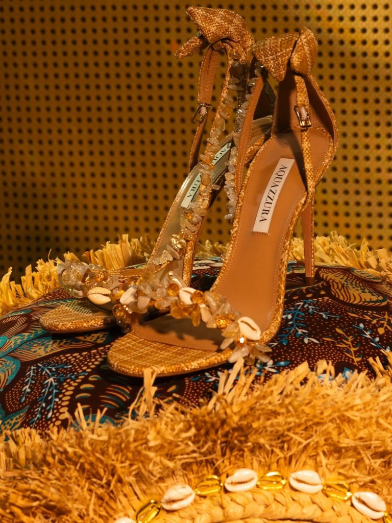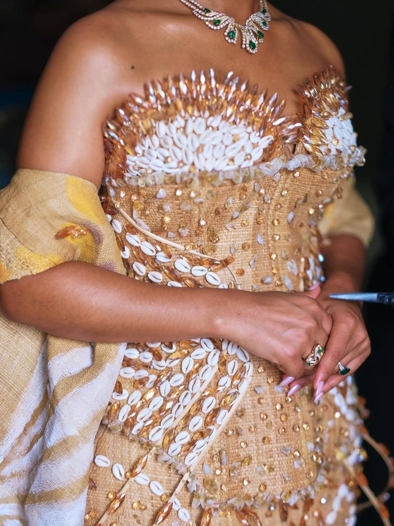 Julia’s base look was already a stunner: a raffia corseted top with a matching skirt, dripping in gold sequins and cowries, accessorised with strappy gold heels and statement jewellery. Pure luxury, but rooted in meaning. Raffia, she explained, isn’t just fabric — it’s history, spirit, and the heartbeat of African tradition. Cowries? Once currency, now symbols of wealth, fertility, and protection. Fashion and storytelling rolled into one.