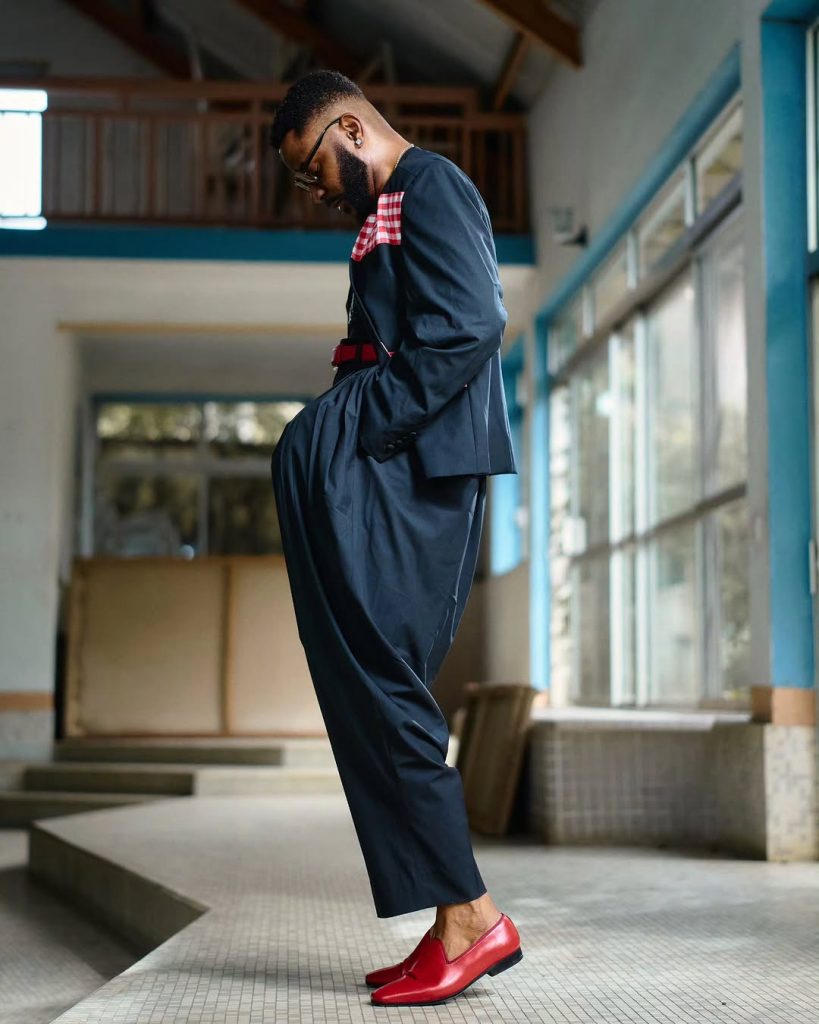 He anchors it with high-waisted, wide-leg trousers (because if the silhouette isn’t dramatic, what’s the point?) and cinches everything with a red leather belt sharp enough to lead a band. A black crew-neck tee grounds the look, while glossy red loafers drop the mic on subtlety — a direct nod to Shina Peters’ flamboyant, stage-commanding style.