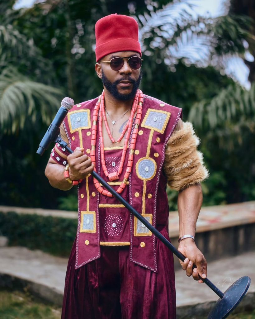 Ebuka’s outfit? A burgundy and gold dream that married tradition with drama. Richly embroidered in geometric and spiral motifs that felt straight out of an Igbo folklore fantasy, his jacket looked like something you’d see at a royal naming ceremony — or, in this case, prime time television. The matching tunic and trousers kept things grounded, while a red cap and coral beads brought the heritage loud and proud.