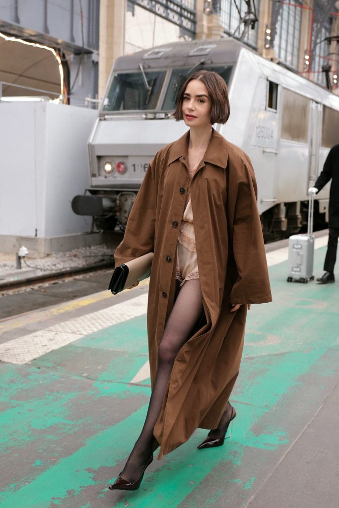Spotted boarding the Orient Express in Paris yesterday, Collins stepped into a travel look that felt unmistakably Emily-coded. The Saint Laurent ensemble relied on a restrained palette of peach and chocolate brown, but restraint ended there. The pieces themselves carried the audacity of a Midwestern PR mogul who treats fashion as a form of optimism.