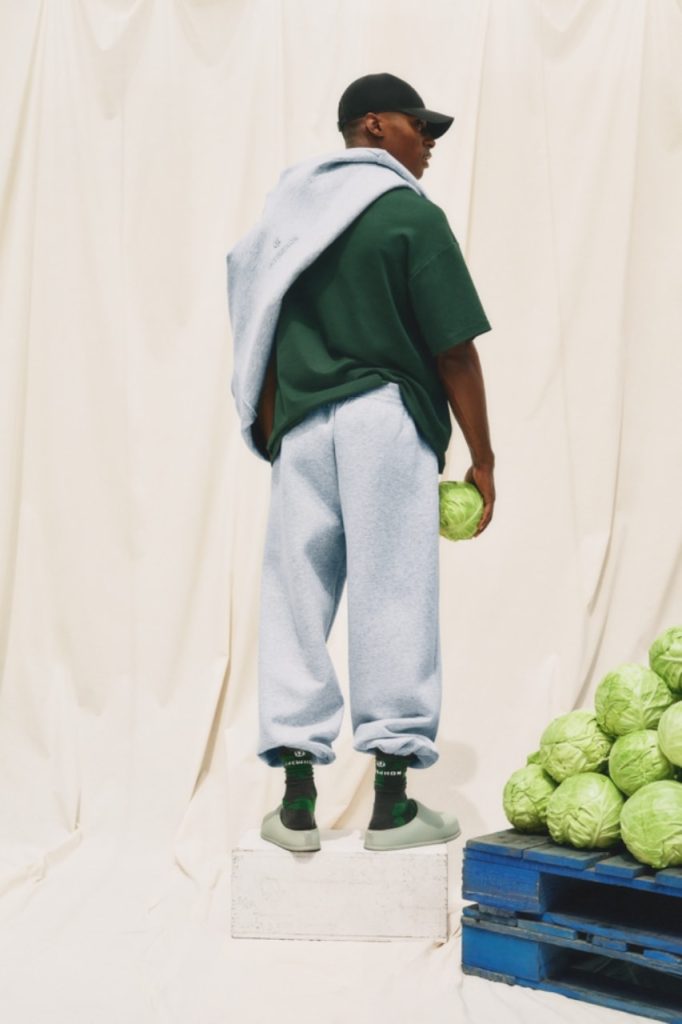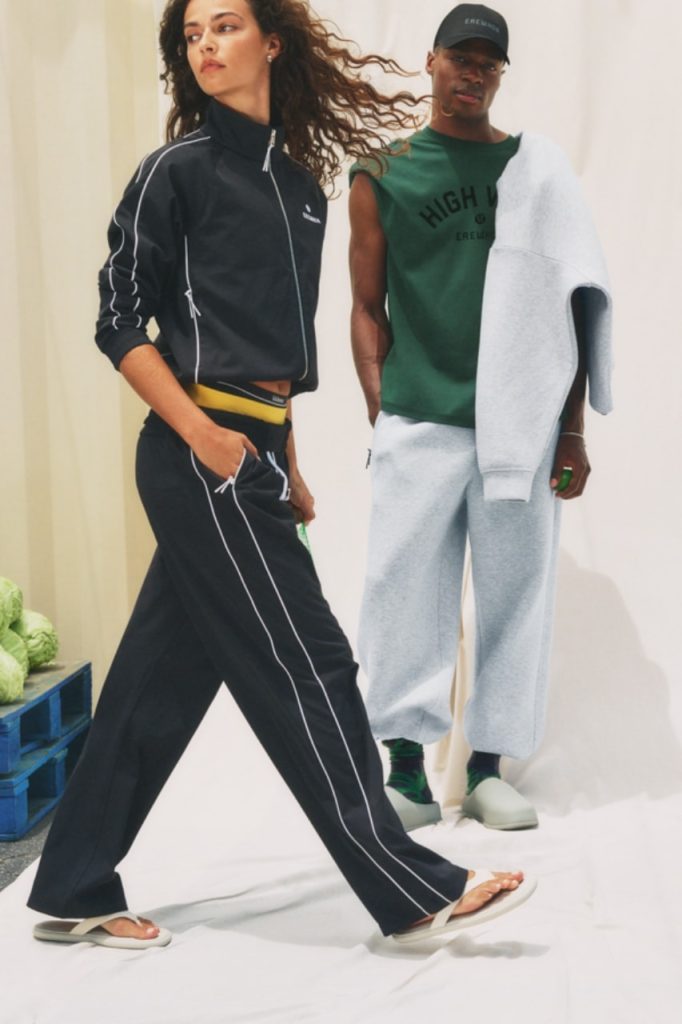 Standouts include the Brentwood Track Pant and Track Jacket, both trimmed with contrast piping and the kind of relaxed tailoring that says “I meditate and have a side hustle.” The “Fresh Produce” graphic tee injects humor into the mix — a wink to Erewhon regulars who know that “fresh produce” often means a $20 bottle of juice.