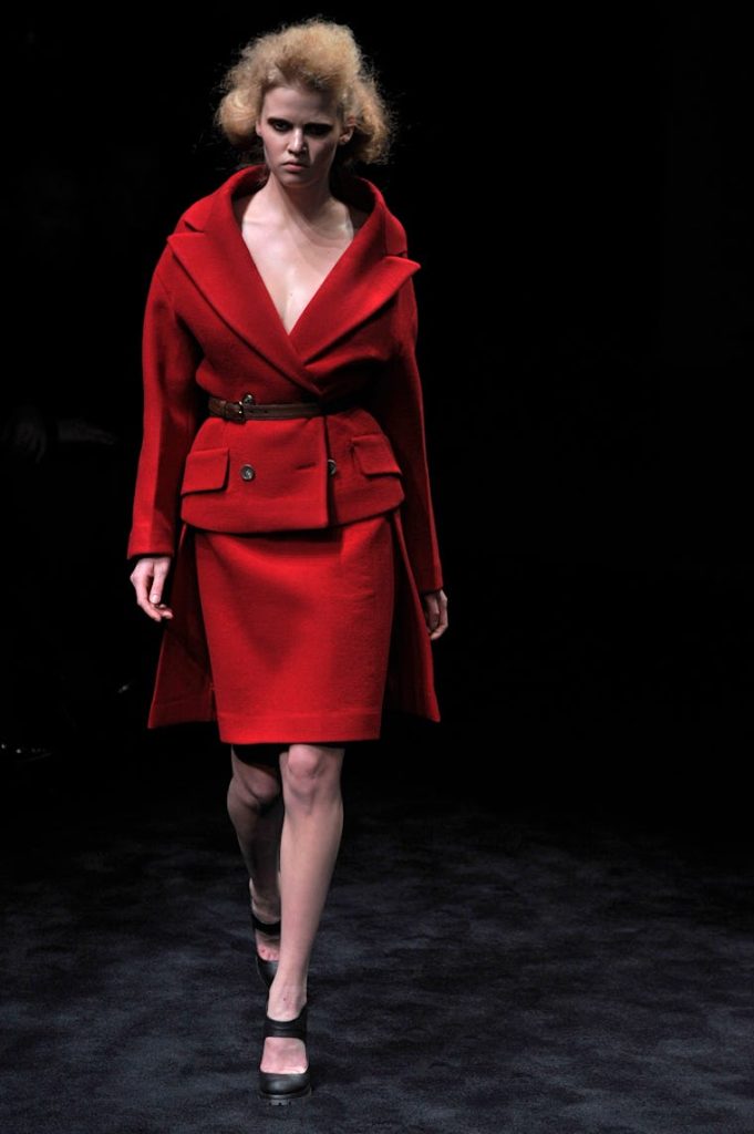 Though custom-made, the suit draws clear inspiration from Prada’s archives. A similar crimson look appeared on the Fall 2009 runway, where Miuccia Prada explored themes of restraint and feminine strength through structured tailoring and minimal color palettes. At the time, the collection’s rare bursts of red stood out against an otherwise muted lineup, an aesthetic that feels newly relevant here.