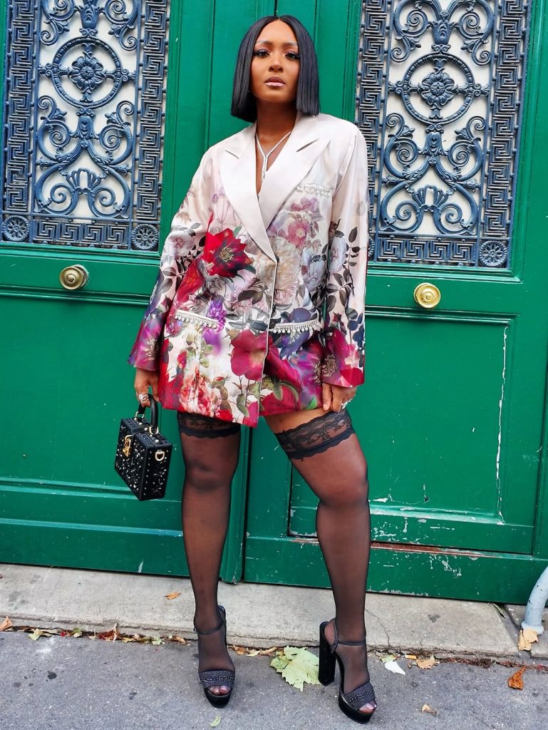 First up was a floral blazer jacket and matching stockings by Lanre Da Silva Ajayi. Now, we’ve seen florals in Paris. We’ve seen blazers. But florals this good? On a blazer this sharp? Styled with a crisp bob and block heels that said “don’t mess with me unless you’ve walked a mile in these”? Icon behaviour.