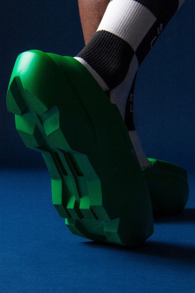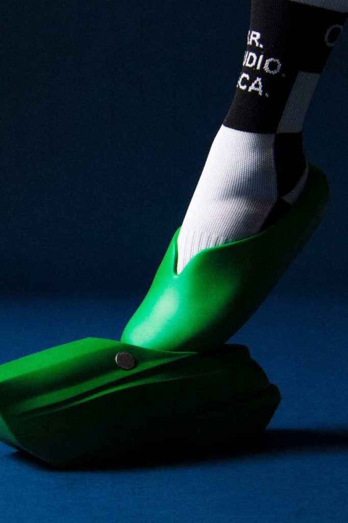 Then there’s the standout: the Future Clog. Equal parts playful and practical, this silhouette reimagines the chunky form of traditional Dutch clogs through a contemporary lens. Available in bright green or clean white, the design features a removable mule insert, allowing it to transition seamlessly from indoor slipper to outdoor shoe. Comfort meets concept — and somehow, it works.