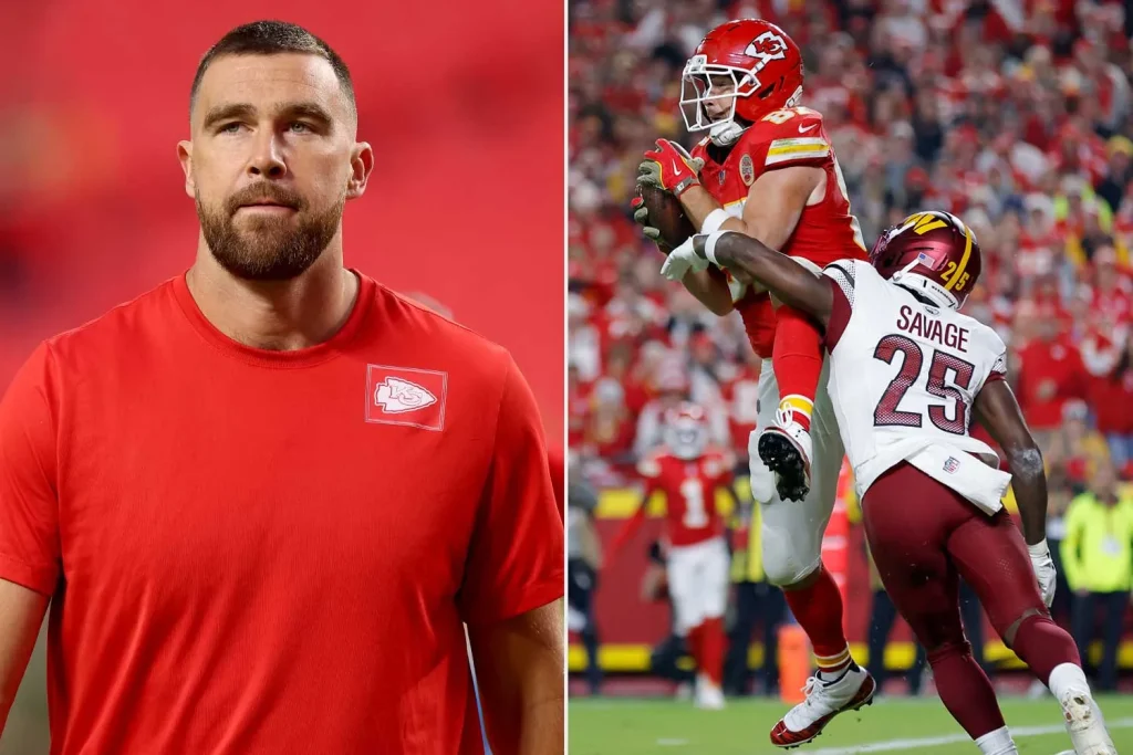 On Monday night, Swift, 35, showed up in full “football wife, but make it Vogue” mode — a sleek red turtleneck and her signature scarlet lipstick — as she cheered on fiancé Travis Kelce during the Chiefs’ clash with the Washington Commanders.