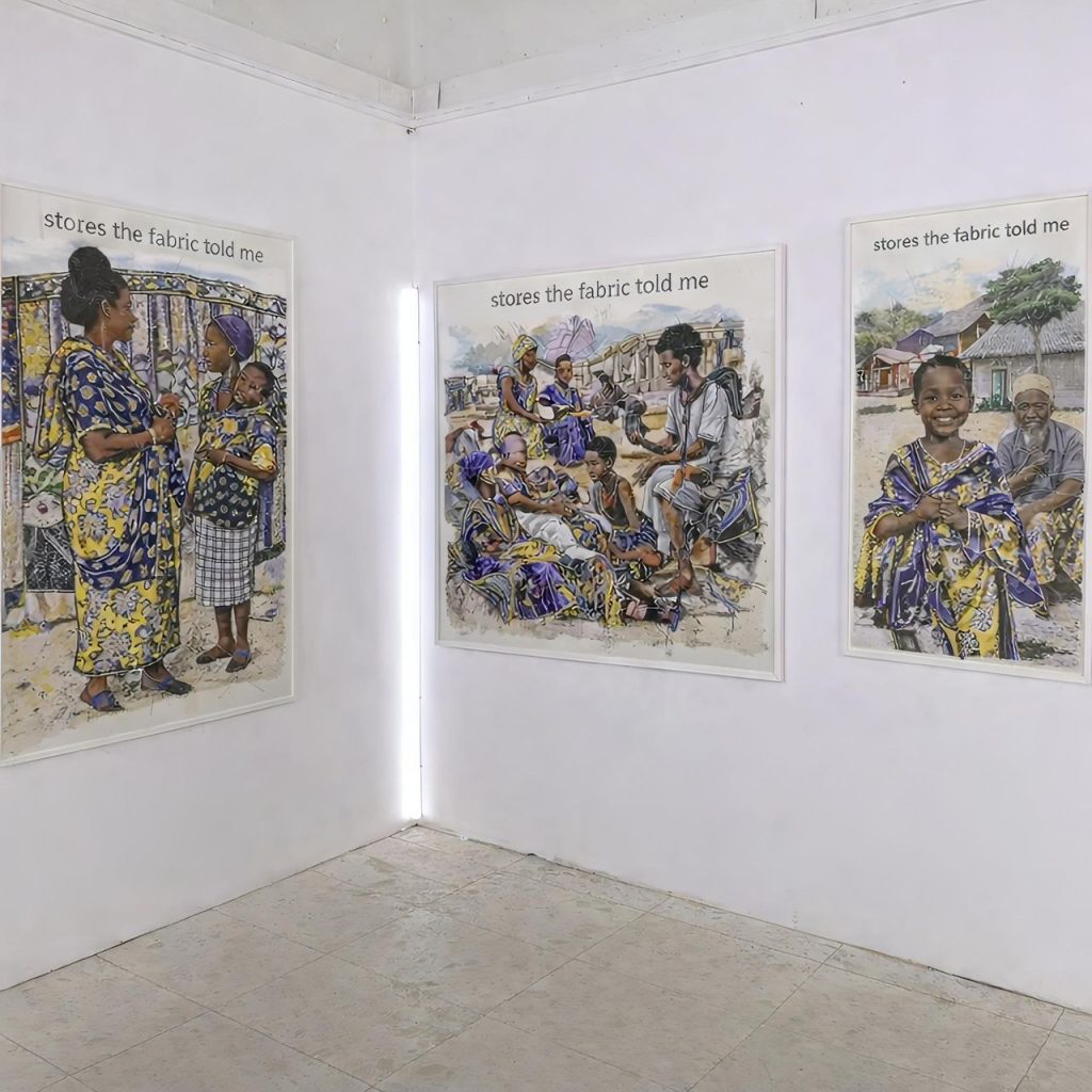 Across the gallery, figures gathered in quiet, intimate scenes women seated together, children leaning into elders, moments that felt both specific and familiar. The textiles in these works did more than dress the subjects; they anchored the stories. Every fold, every repeated motif carried weight, hinting at histories stitched into everyday life.