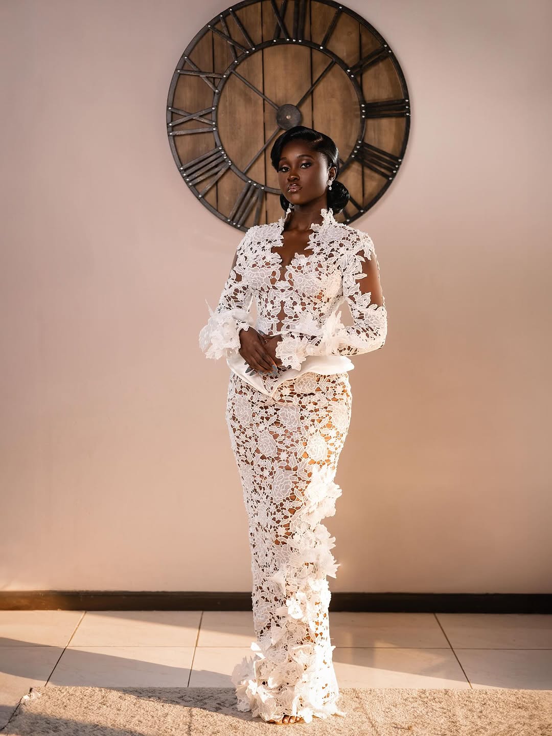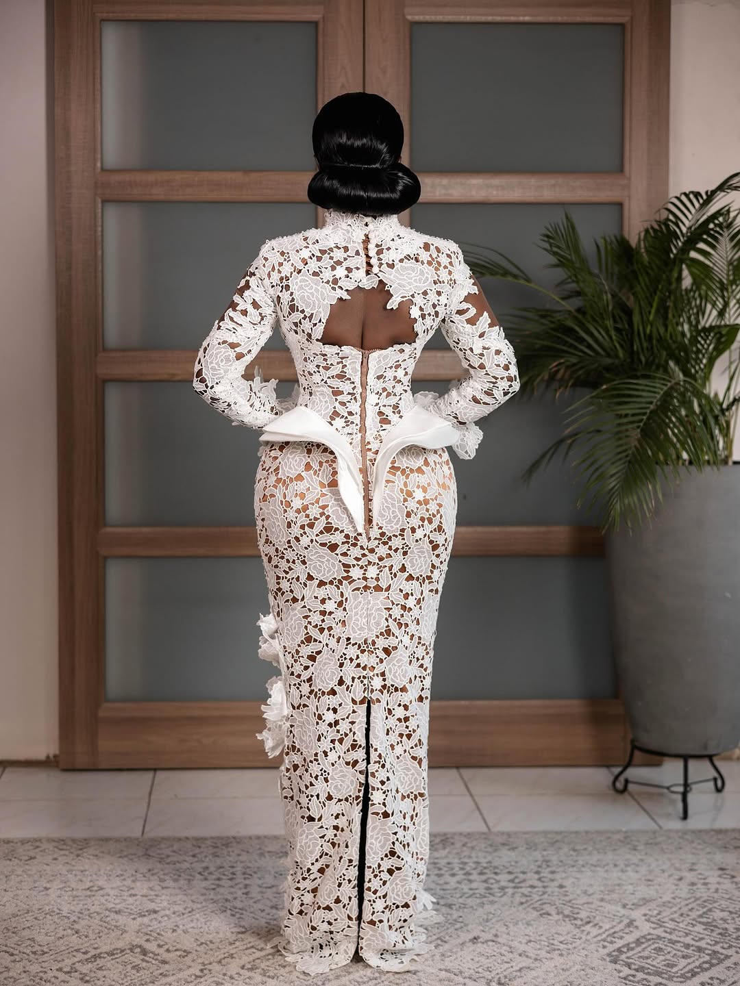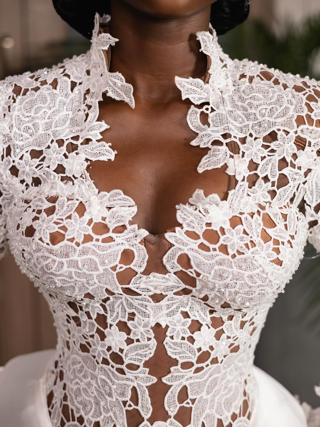 The gown features delicate lace petal motifs that run across the entire silhouette, creating a soft, romantic texture that feels both couture and effortlessly modern. The plunging neckline? Bold. The layered waistline? Architectural. Together, they strike the perfect balance between sophistication and rebellion — for the bride who’s done playing by the rules.