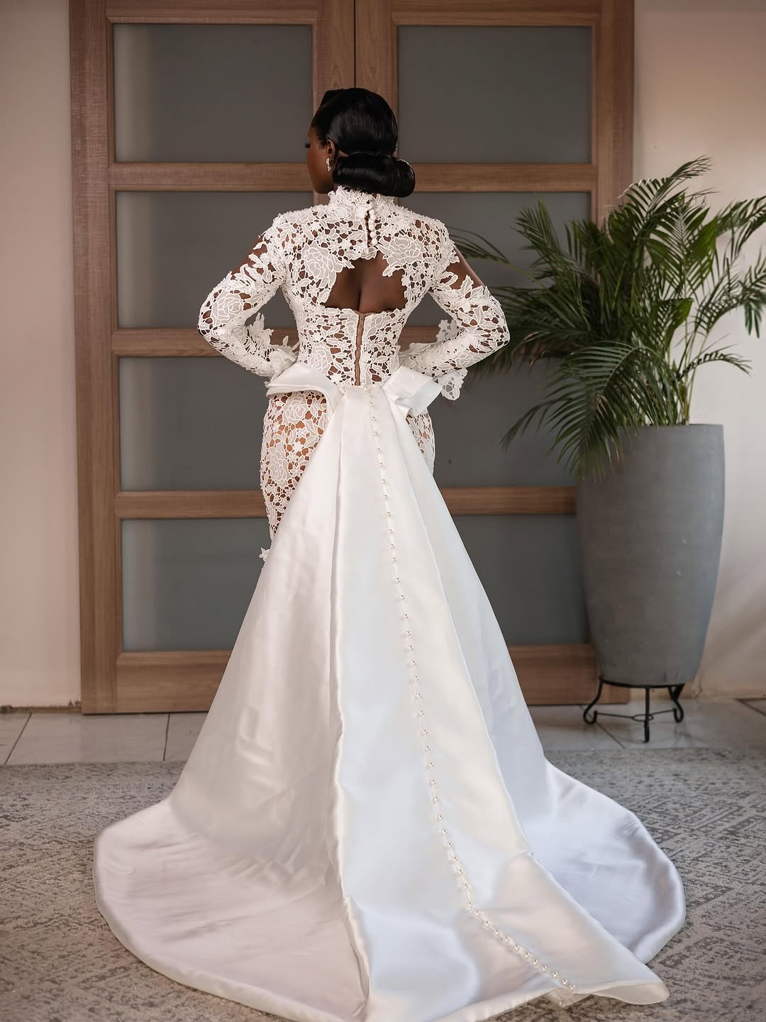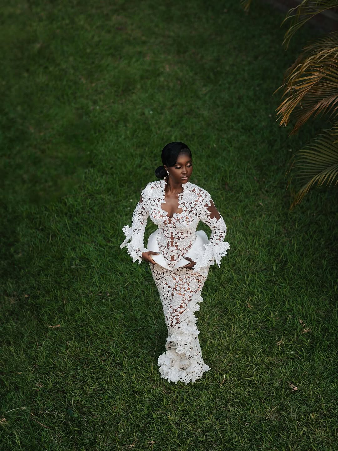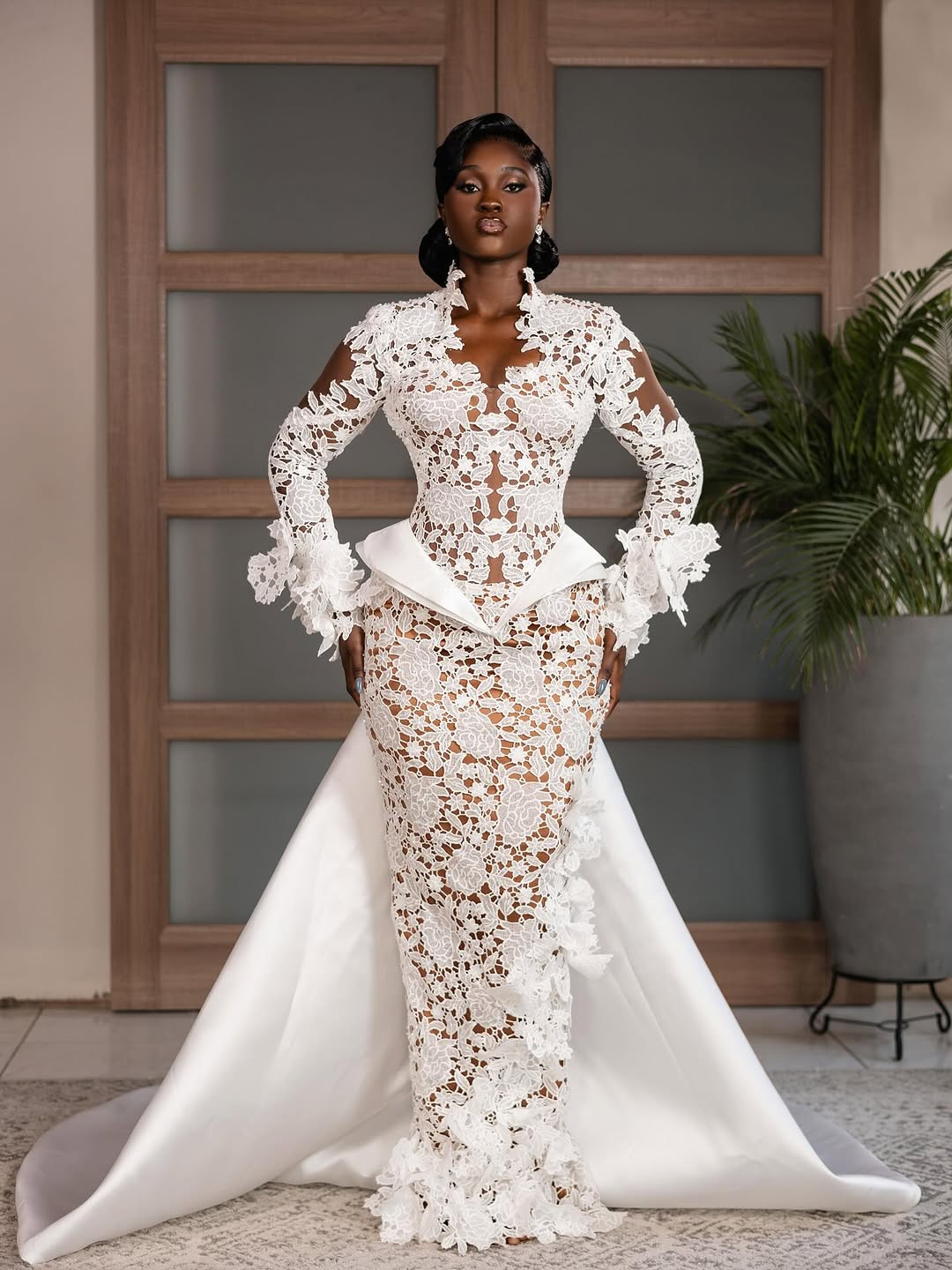 The gown features delicate lace petal motifs that run across the entire silhouette, creating a soft, romantic texture that feels both couture and effortlessly modern. The plunging neckline? Bold. The layered waistline? Architectural. Together, they strike the perfect balance between sophistication and rebellion — for the bride who’s done playing by the rules.